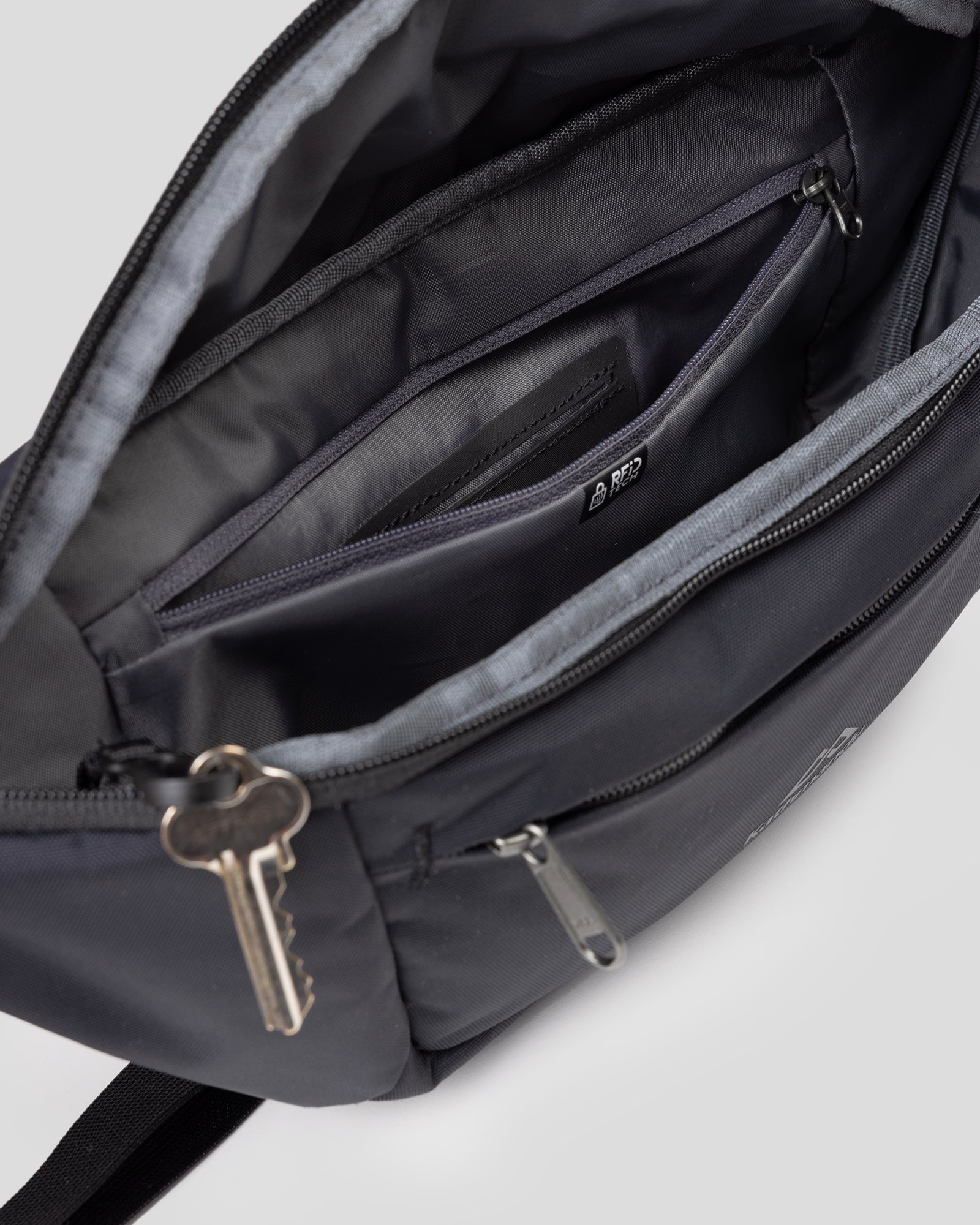 A spacious travel hip pack featuring an RFID protected pocket.